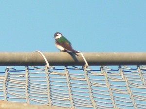 Description/field marks: As the name suggests, Violet-Green Swallows are violet and green. The two colors that aren’t mentioned are the grayish-brown on the wings, and the white on the underside and cheeks.Violet-Green Swallows have a patch of violet on the rump, and a small strip of white right above it. They have emerald green on the back and head.